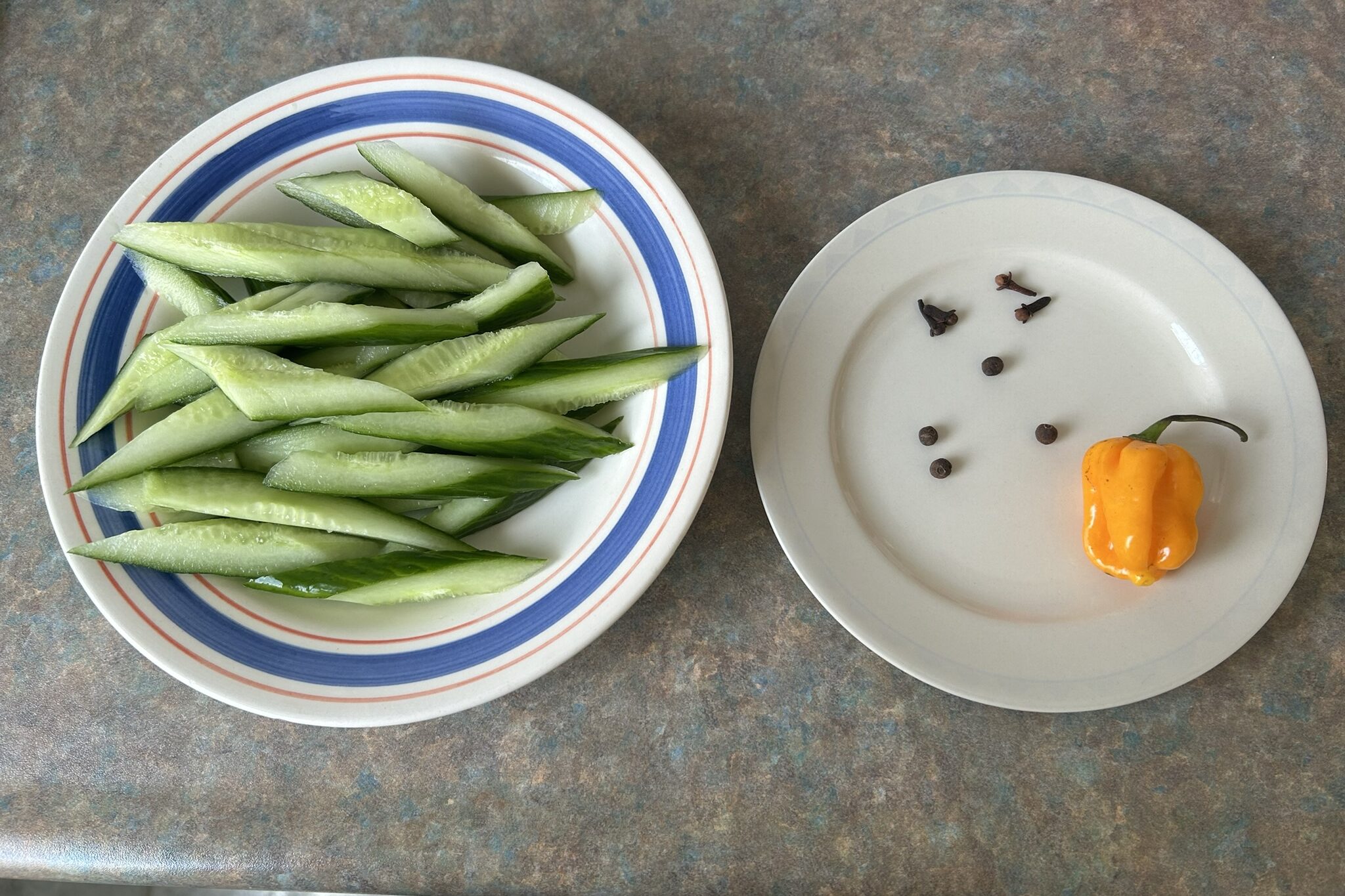 - Plaats hierna de komkommerreepjes, Madame Jeanette peper, pimentkorrels en kruidnagels in de weckpot.