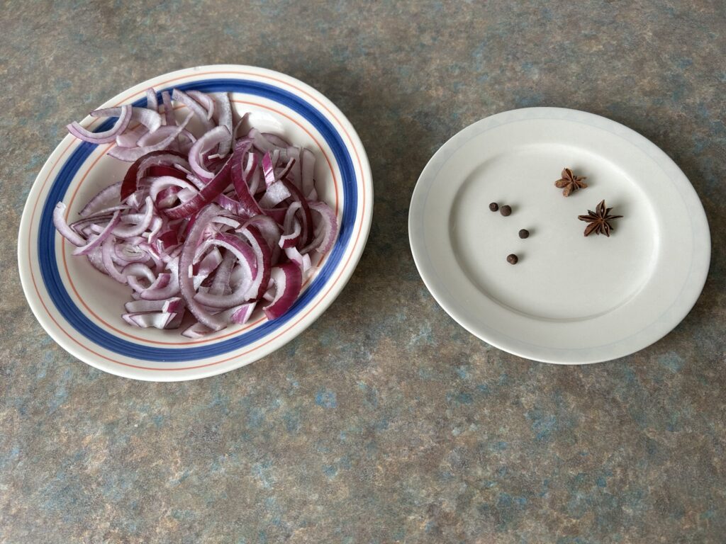 - Plaats de rode uien, pimentkorrels en steranijs in de pot.