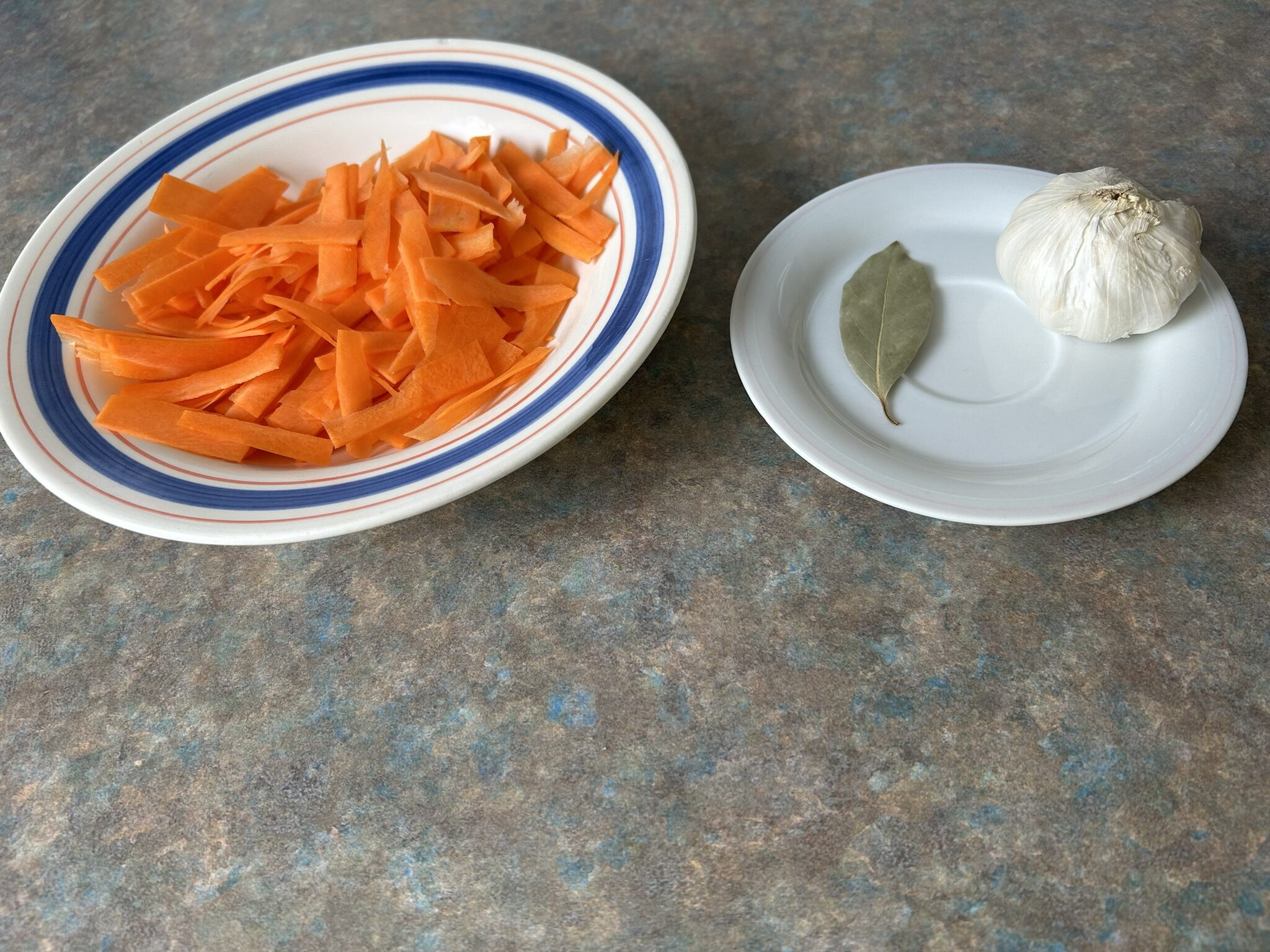 - Vul de weckpot met de wortel, 3 gepelde knoflooktenen, een laurierblad. Voeg een snuf zout toe;