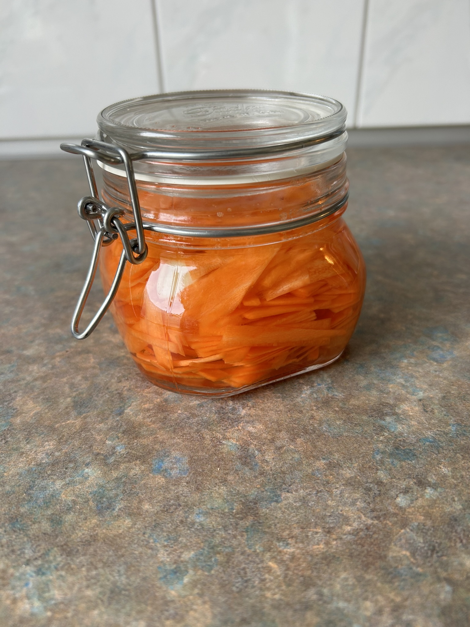 - Giet het water-azijnmengsel in de weckpot en zorg ervoor dat de wortel volledig ondergedompeld is;