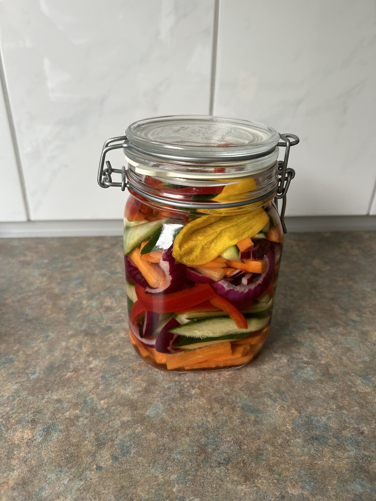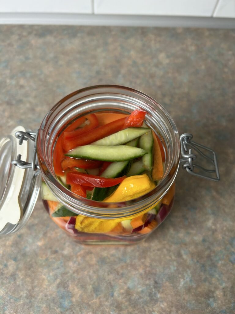 - Maak in de maatbeker een mengsel van water, azijn en suiker. Roer dit goed door en giet dit over de groenten totdat het volledig ondergedompeld is.